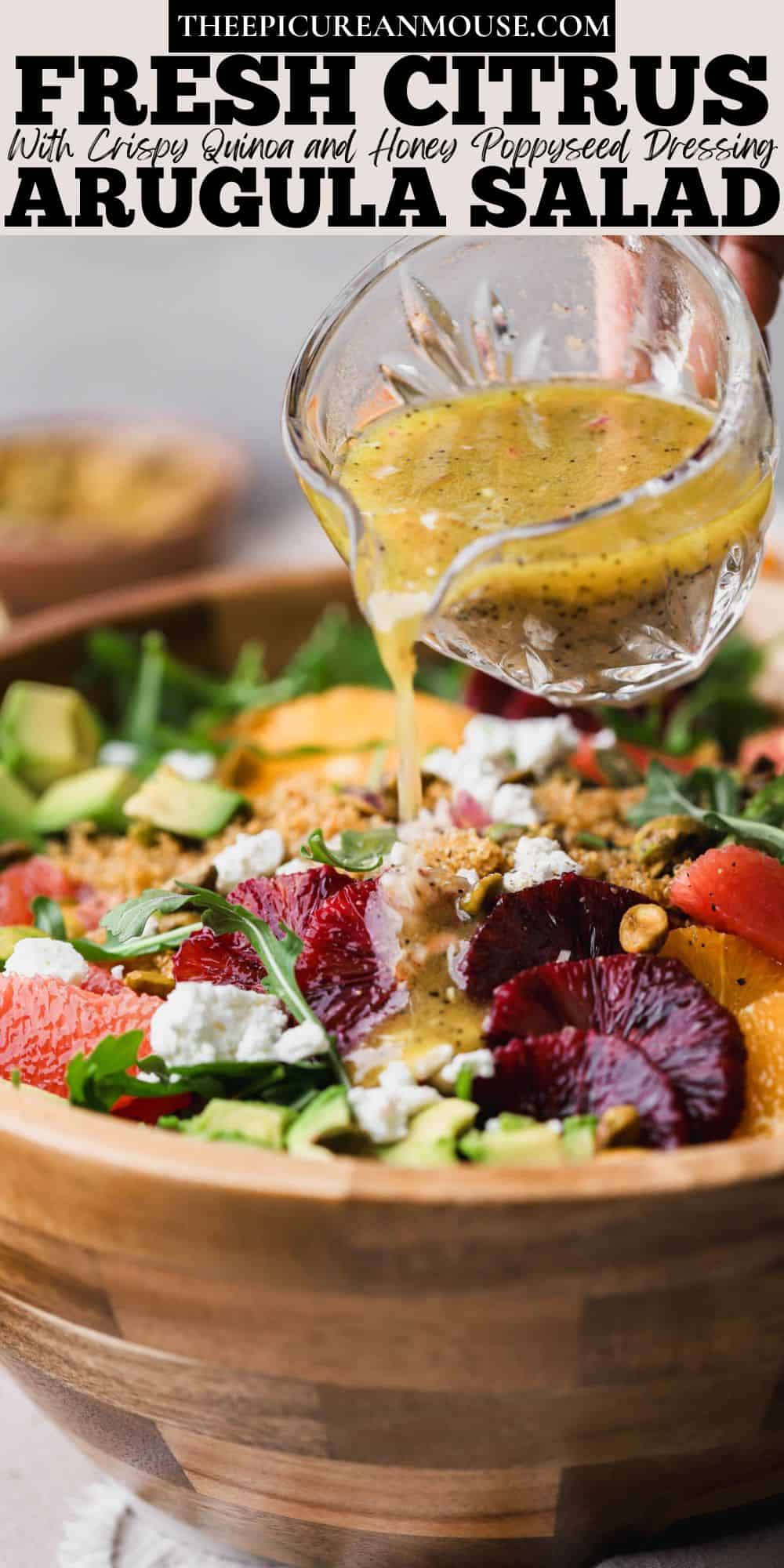 - Add the arugula to a large salad bowl. Arrange the citrus segments on top of the greens. Drizzle a small amount of dressing over the salad. Gently toss to combine, ensuring all the ingredients are well-coated. Then, top with crispy quinoa, diced avocado, crumbed feta, and toasted pistachios.
