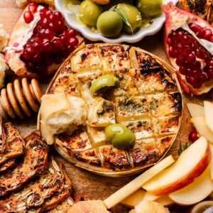 STEP 4: Finish and serve. Once the brie is out of the oven, let it rest for a minute. Then, top with freshly grated lemon zest and a handful of olives. You can also drizzle it with a little extra honey, if you want. Serve immediately with your fruit, bread, and crackers for scooping.