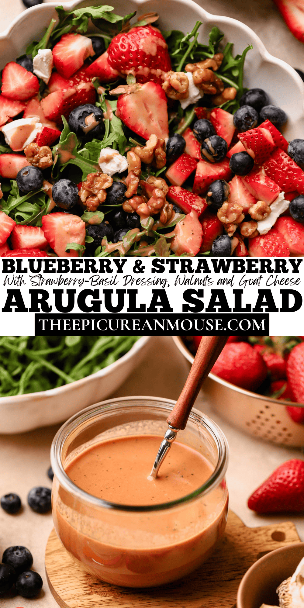 This simple Blueberry and Strawberry Salad is all about fresh ingredients and bold flavor. You’ve got sweet, juicy strawberries, plump blueberries, creamy goat cheese, and crunchy walnuts layered over a bed of peppery arugula. But what really pulls it together is the vinaigrette—a homemade strawberry balsamic dressing that’s sweet, tangy, and just a little herby thanks to the fresh garden basil blended in.