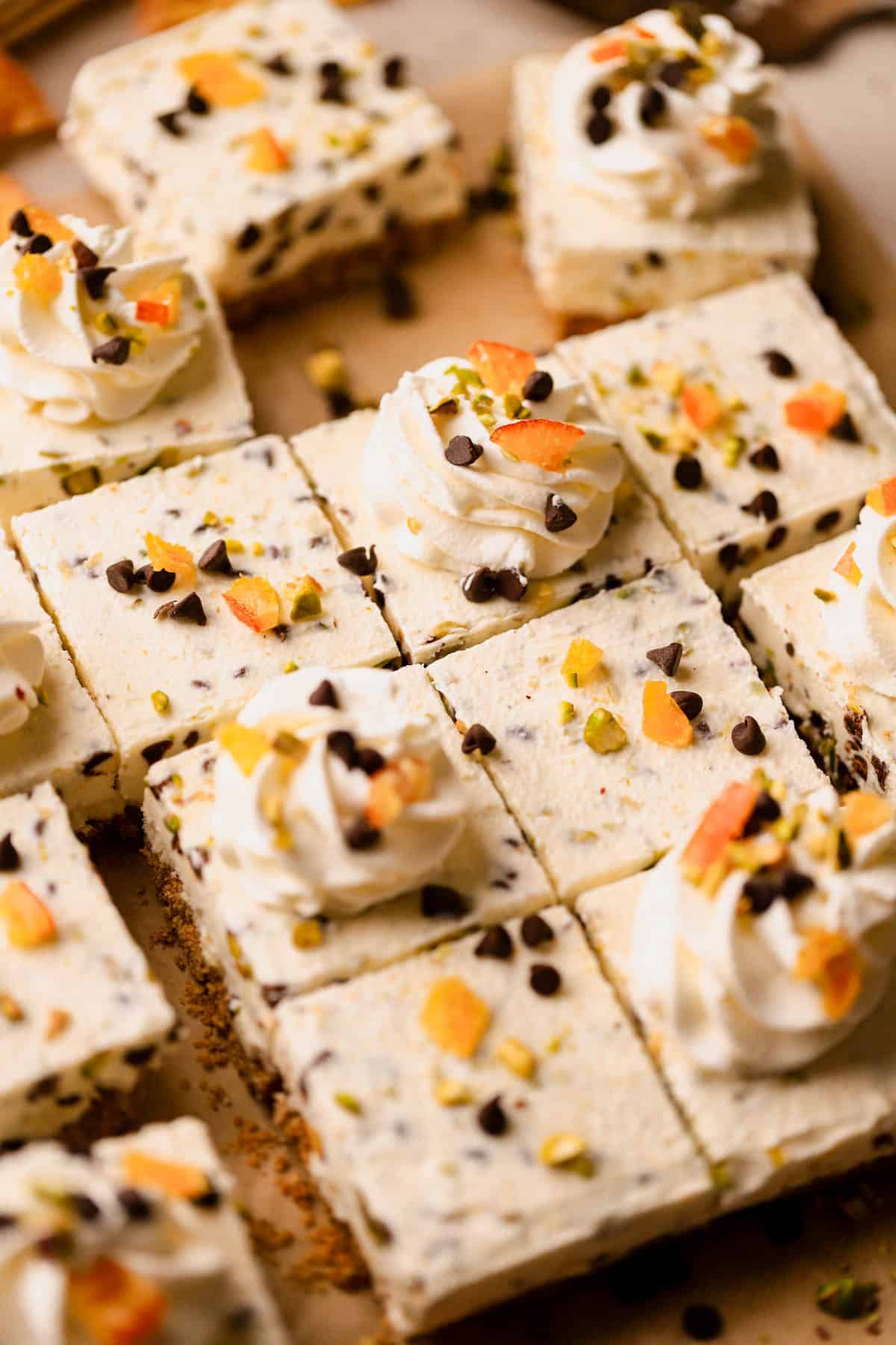 - Gently lift the cheesecake out of the pan using the parchment paper overhang. Slice the chilled cheesecake into 16 pieces. Then, top with homemade whipped cream and sprinkle with extra mini chocolate chips, pistachios, and diced orange peel.