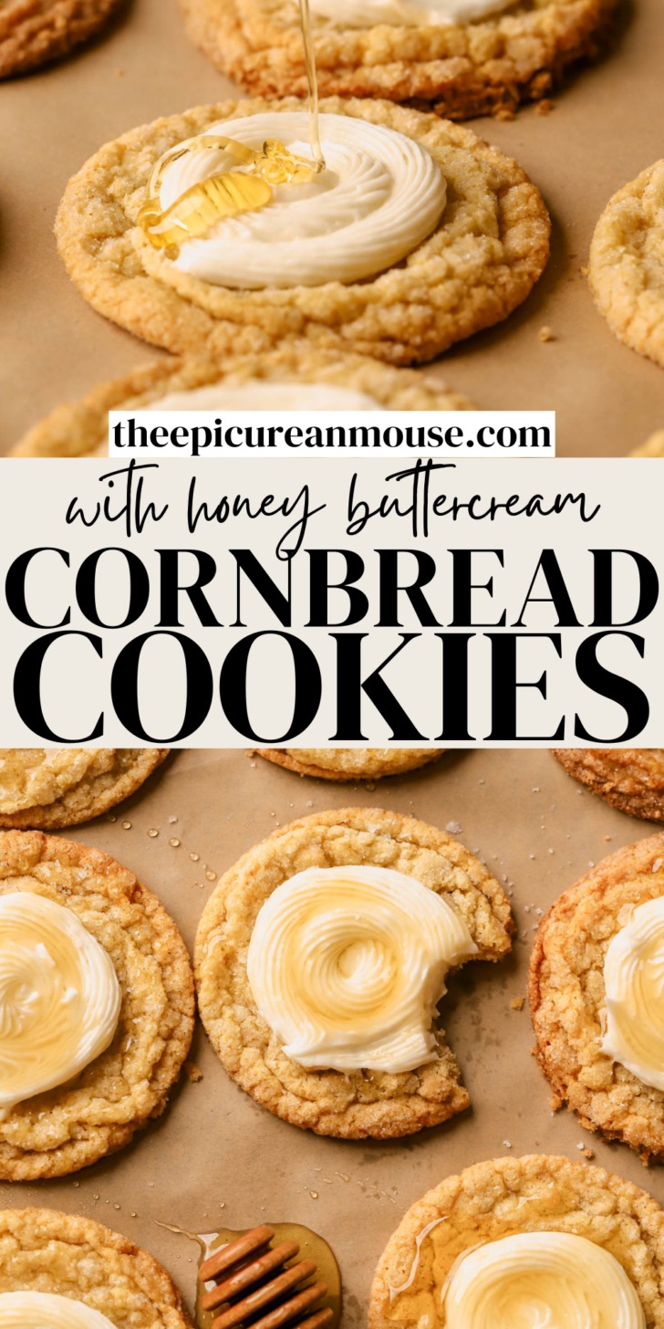 These Cornbread Cookies are everything you want in a bakery-style treat. The brown butter gives them a rich, nutty flavor, while the cookies themselves have soft, chewy centers and just enough crisp around the edges. They’re finished with a smooth honey buttercream frosting and a sprinkle of flaky sea salt.