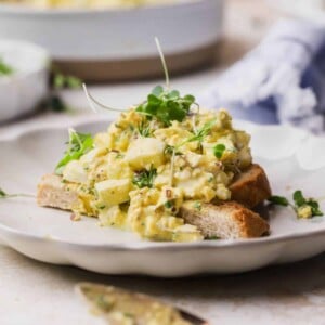 If I could have anything for lunch, it would definitely be this Dill Pickle Egg Salad. Perfectly cooked hard boiled eggs, combined with juicy dill pickles, sweet relish, crisp red onion, fresh herbs and tangy dijon mustard. Spoon it on top of toasted sourdough bread and top it with tender micro greens for the most impressive and satisfying meal.