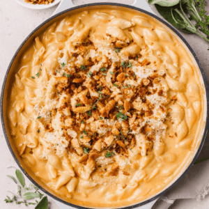 It’s all about comfort food in the cooler fall and winter months. This Dutch oven mac and cheese is rich and gooey and oh so comforting. It combines perfectly cooked pasta, coated in the creamiest butternut squash cheese sauce and a buttery cracker crust with fresh sage and thyme.