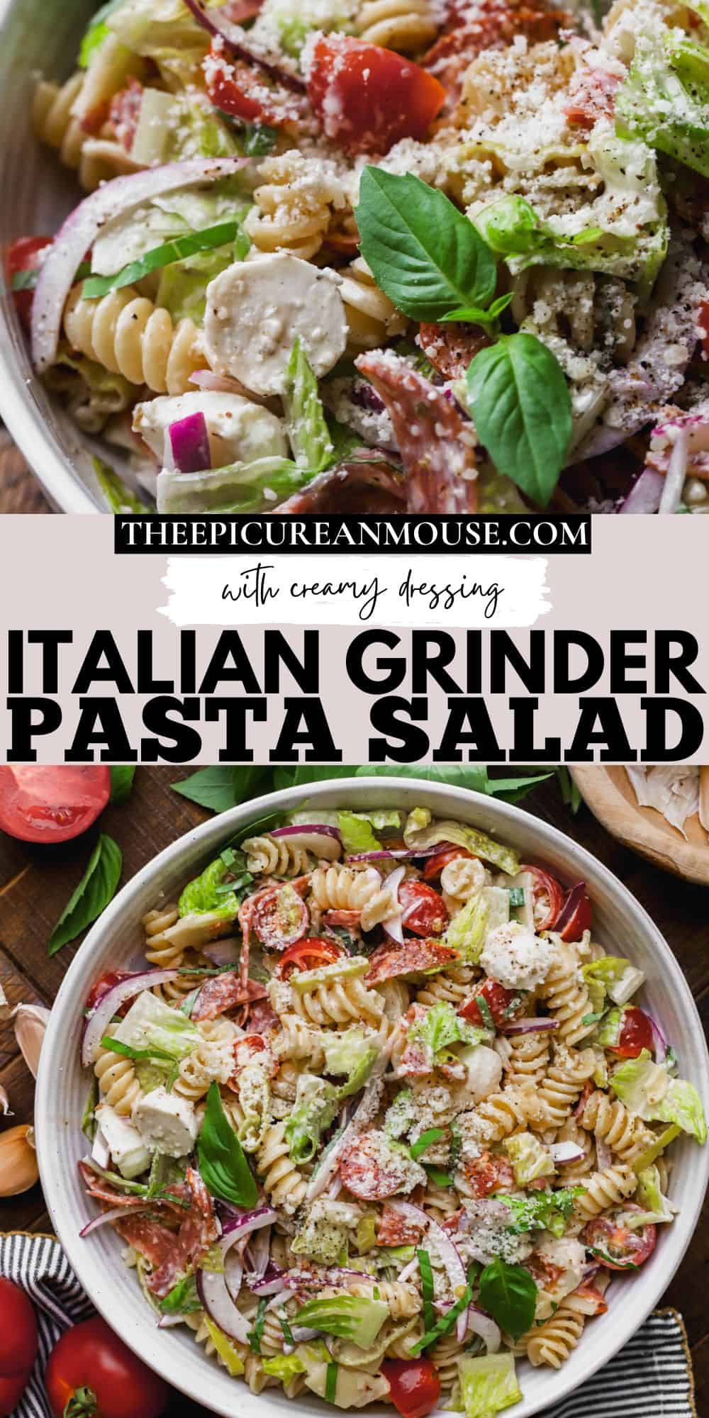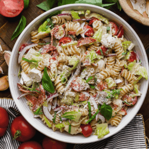 Grinder Pasta Salad combines perfectly cooked al dente pasta, creamy Italian dressing, cured meats, fresh herbs and a variety of cheeses. It’s perfect for hot summer days, light yet filling, and is a refreshing option for picnics, potlucks, or easy dinners.
