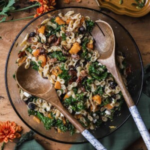 This Fall Pasta Salad is a perfect blend of seasonal ingredients and bold flavors. Roasted butternut squash adds warmth, candied bacon brings a sweet-savory crunch, and dried cranberries add a little tartness. Combined with tender pasta, salty feta cheese, roasted pumpkin seeds and crisp kale, this vibrant pasta salad is great for any autumn gathering or as a cozy lunch.