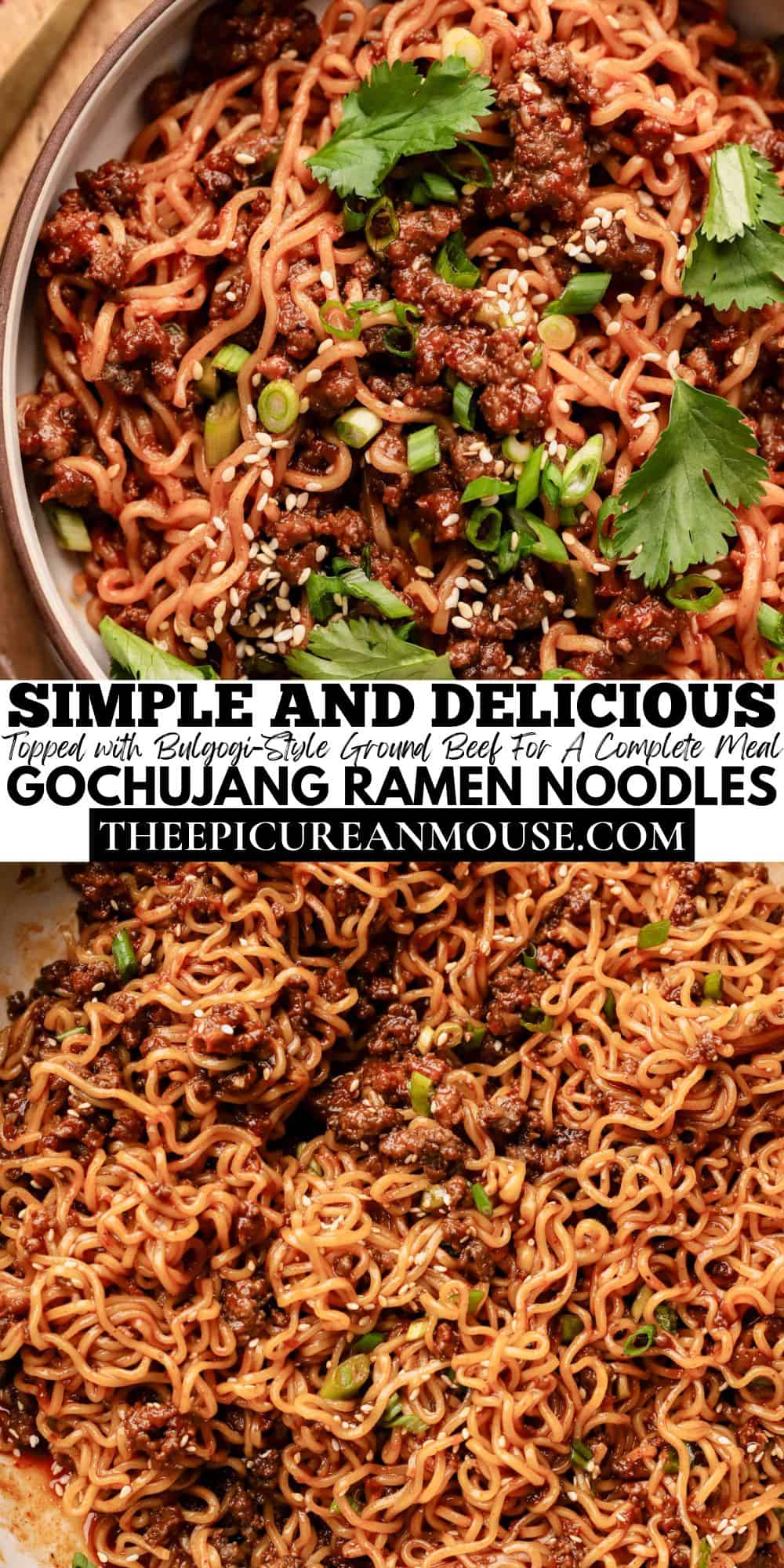 This Gochujang Ramen is made as a quick pan-style dish rather than a soup, with the noodles tossed in a simple sauce made from garlic, mirin, soy, and gochujang. The sauce is lightly sweet with just enough heat and coats the noodles without weighing them down. To make it more filling, I add a quick bulgogi-style ground beef that gets tossed right in with the noodles, then finish everything with cilantro and green onions.
