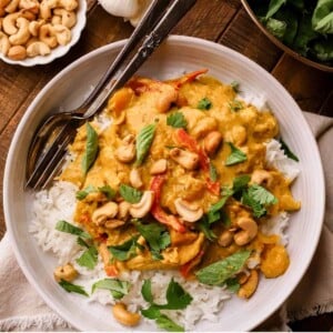 Full of fall-inspired flavors, this Pumpkin Chicken Curry is exactly the kind of feel-good meal you’ll want to make again and again as the weather turns cooler. Made with yellow curry paste, lots of ginger and garlic, sweet pumpkin puree, and creamy coconut milk. The chicken is simmered in the sauce with butternut squash, red bell peppers, and topped with crunchy cashews.