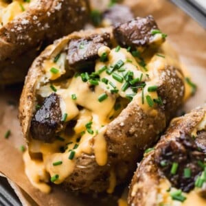 This Steak Baked Potato is made with perfectly caramelized steak bites, nestled inside a hot, salt-crusted baked potato and drizzled with a smooth, velvety cheddar cheese sauce, with a hint of horseradish that adds just the right amount of kick.